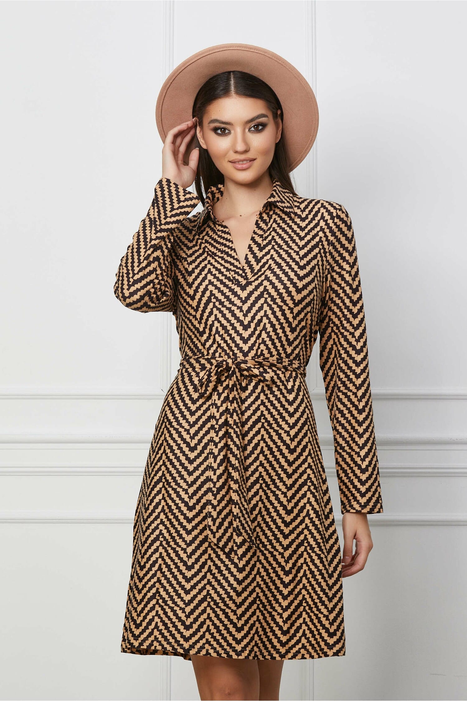 Specification: Rochie Rania bej cu imprimeuri negre si cordon in talie