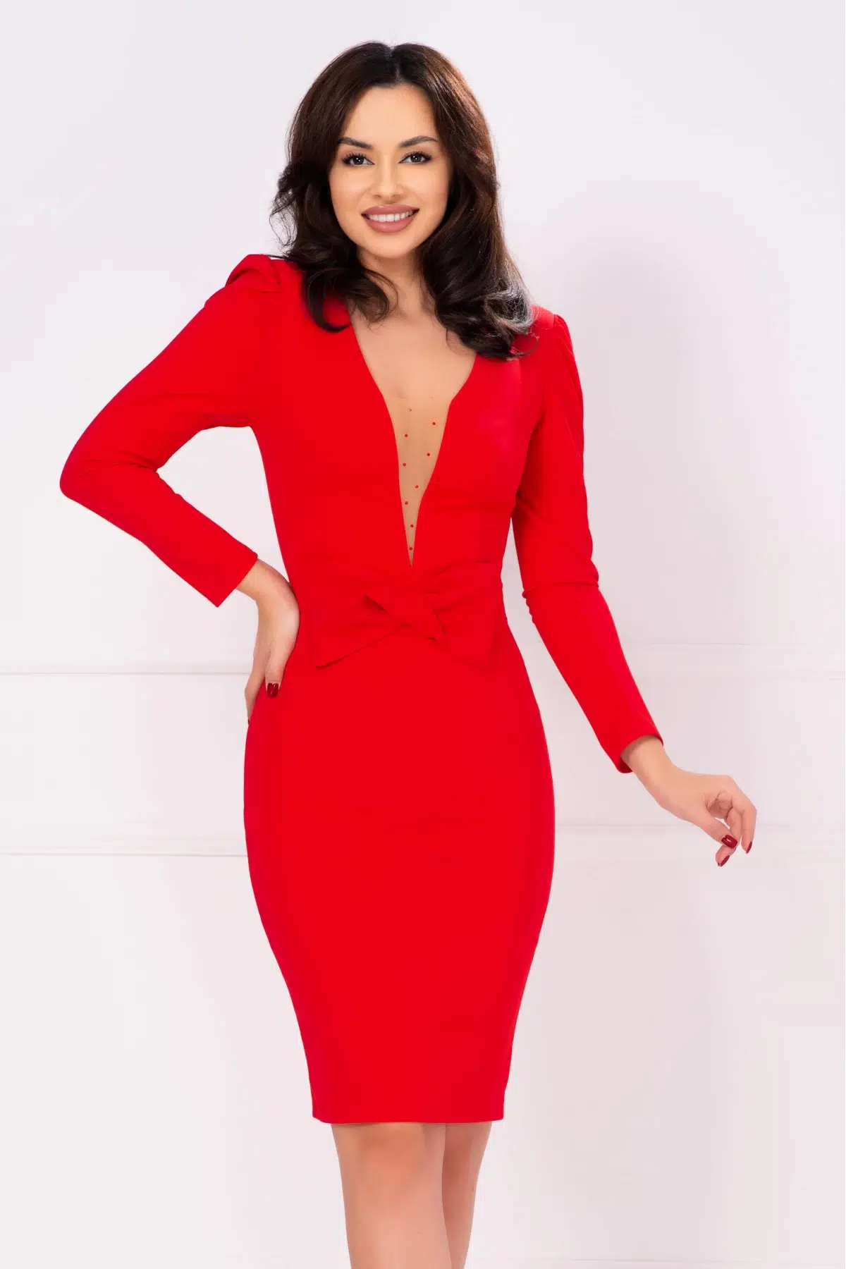 Rochie rosie eleganta Ayana cu funda in talie Culoare: rosuTextura: bistrechCroi: conic cambratManeci lungi Umeri buretatiFunda stilizata in talieDecolteu in V Insertie de tulle bej si strassuri in zona bustuluiInchidere cu fermoar la spateFara dubluraCompozitie: 95% poliester 5% elastanFabricat in Romania* Echipa noastra face toate eforturile in a prezenta cat mai bine culorile produselor prezentate pe site insa culorile pot diferi de situatia reala si pot varia în functie de setarile monitorului/dispozitivului dvs!