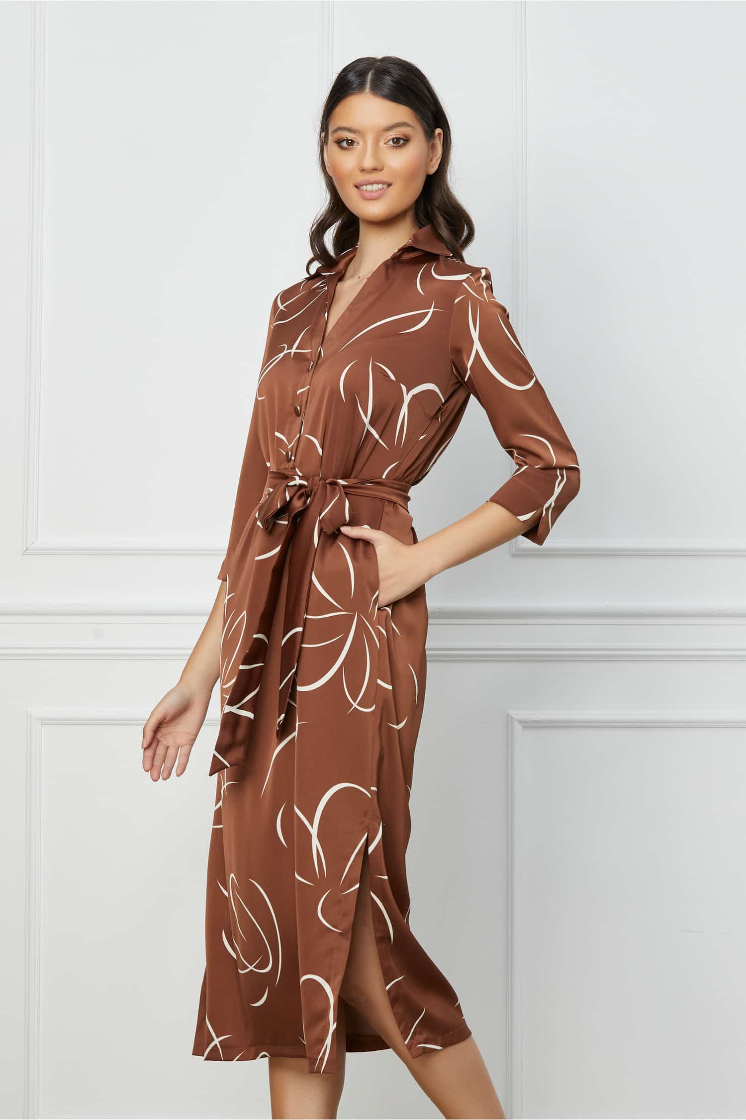Specification: Rochie Sabrina maro din satin cu imprimeuri albe si cordon in talie