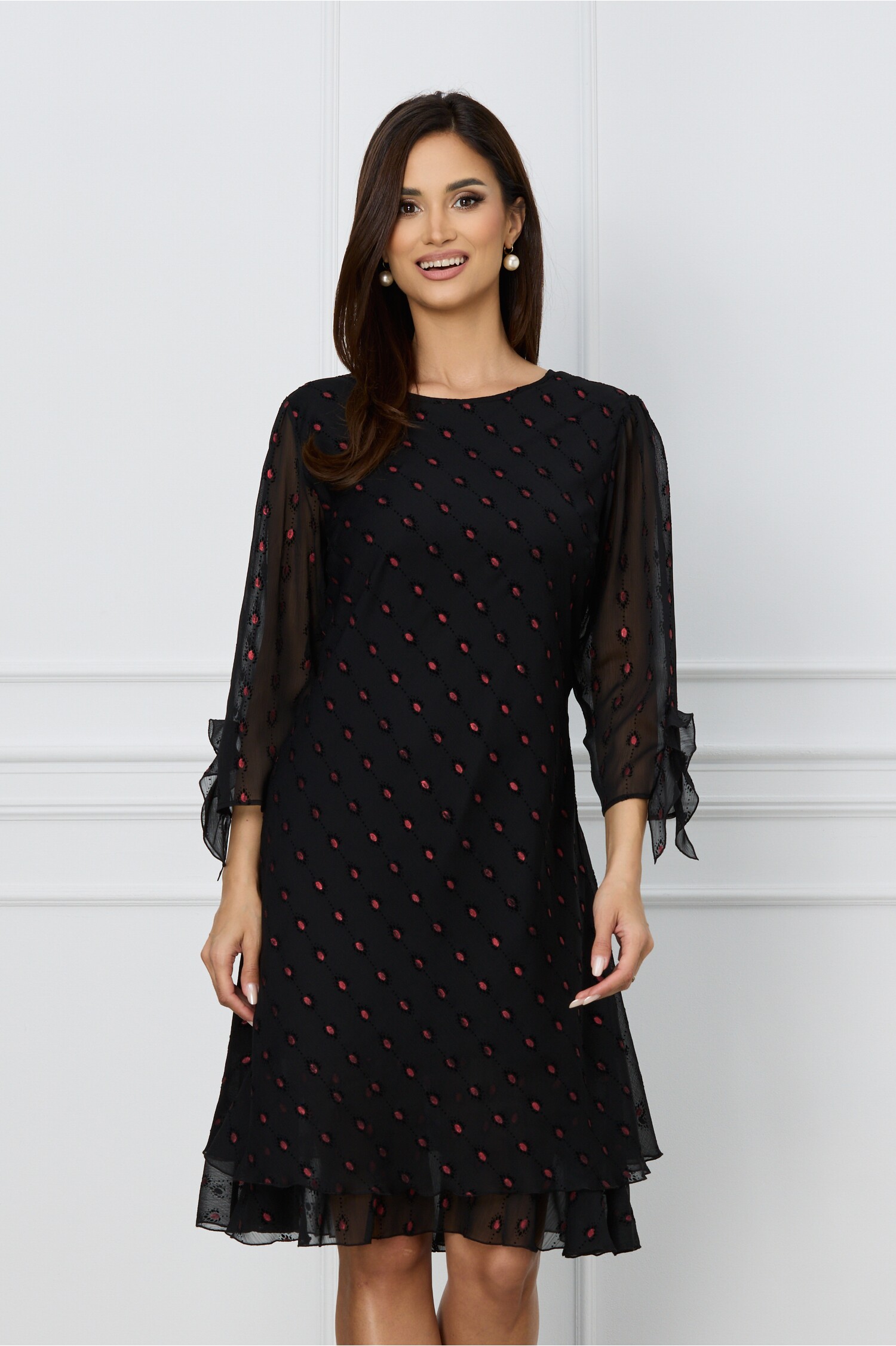 Specification: Rochie Sabrina neagra cu buline bordo metalizat si volanas la baza