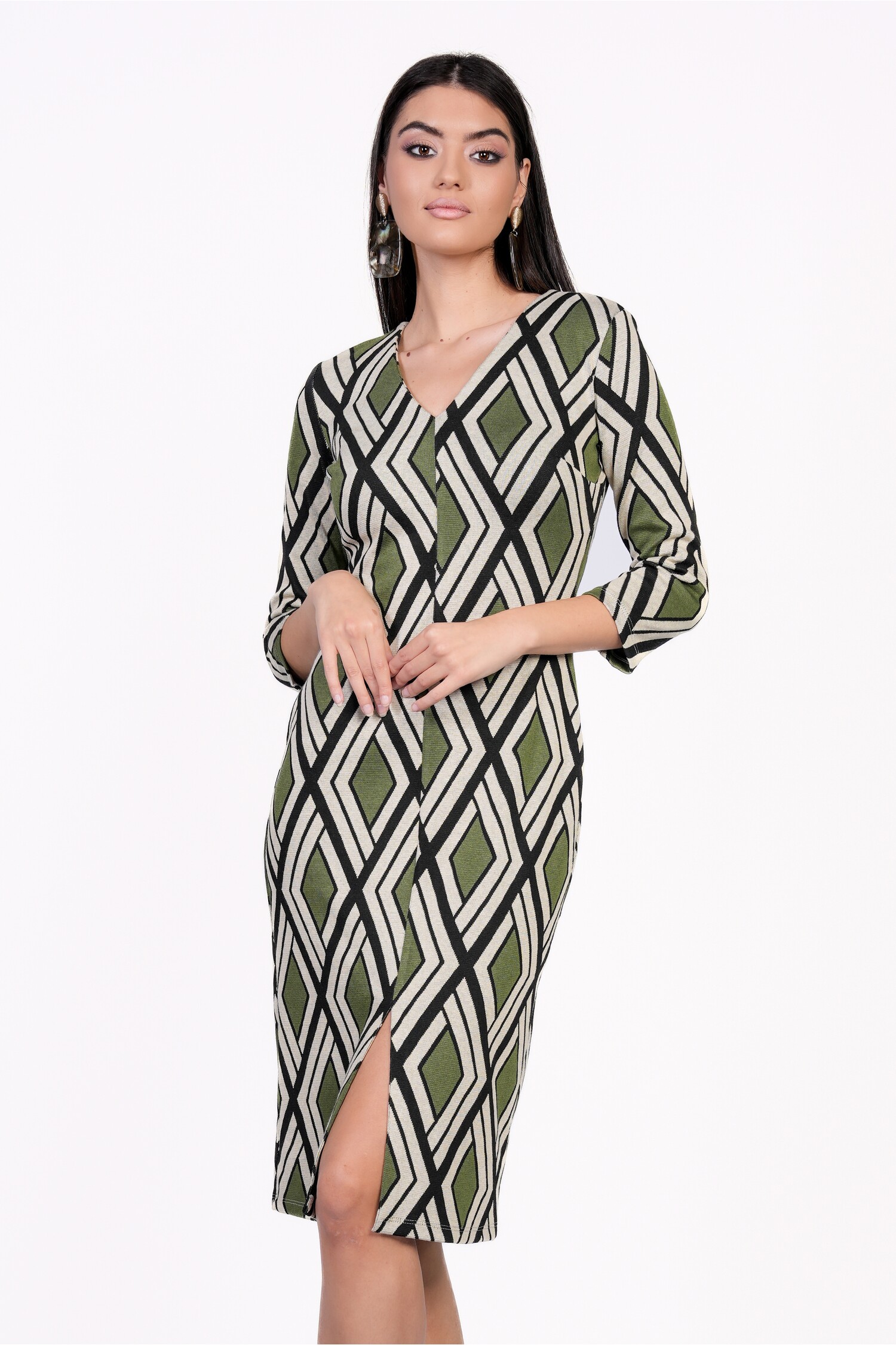 Rochie Sarah kaki cu imprimeuri bej