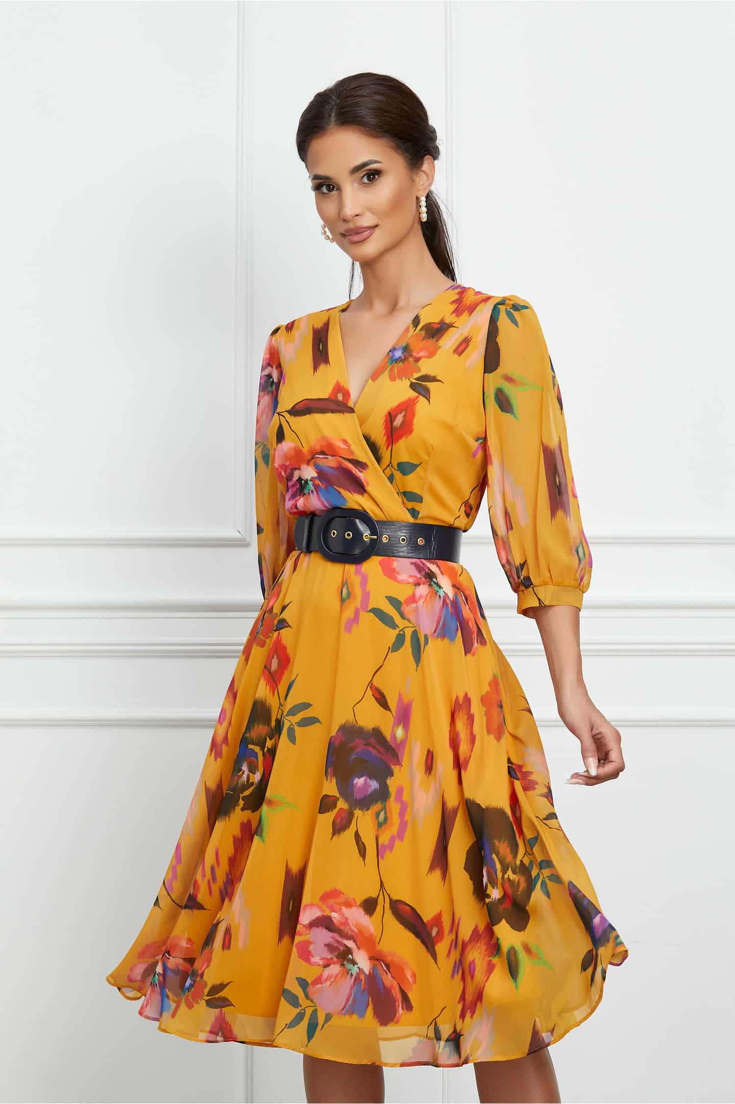 Specification: Rochie Selena galbena cu imprimeuri florale si curea in talie