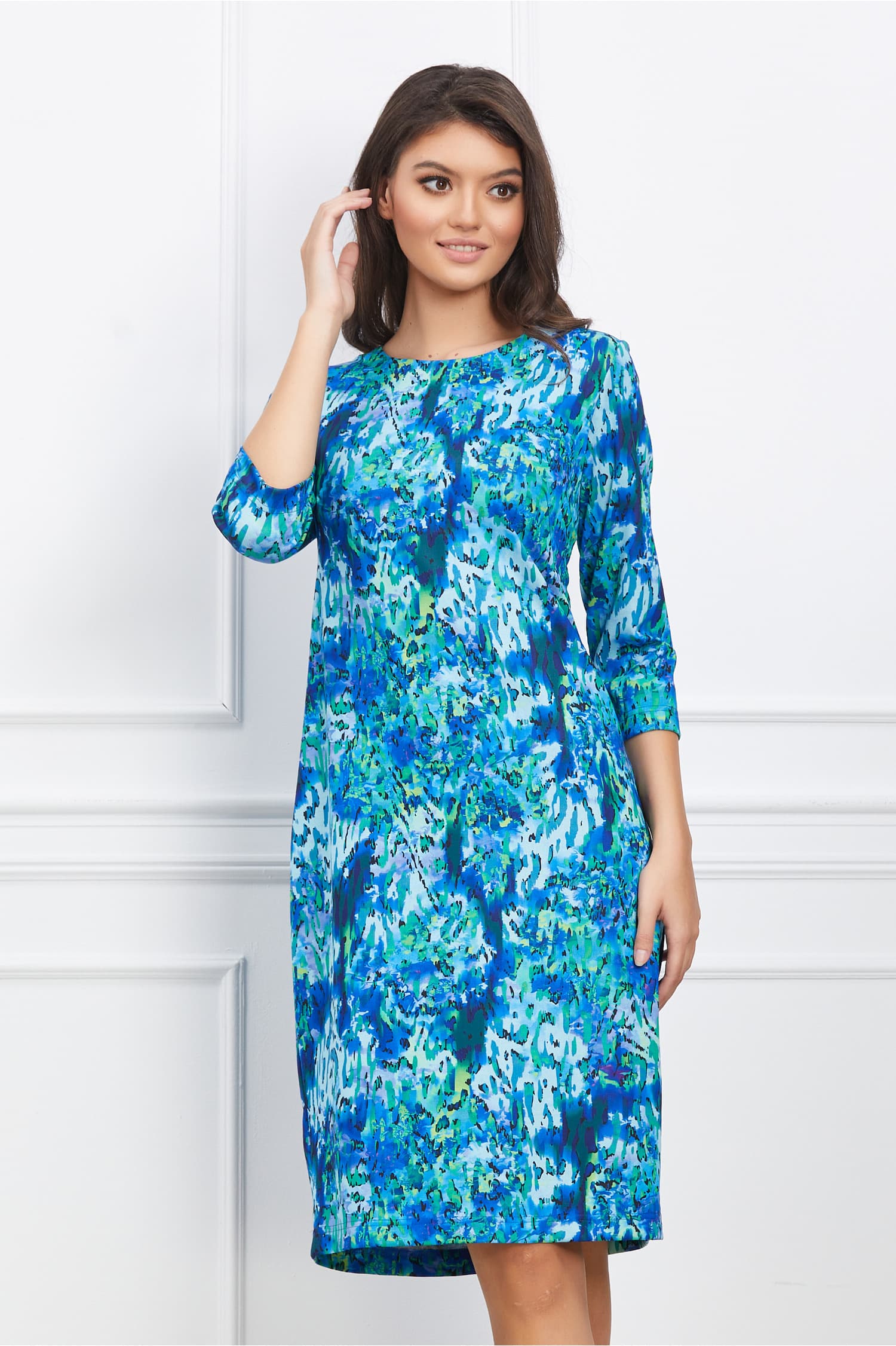 Rochie office cu decolteu oval. Prezinta imprimeu divers pe toata lungimea, maneci trei sferturi si croi cambrat. Rochie office Decolteu oval Imprimeu divers Maneci trei sferturi Croi cambrat Fara captuseala Material: viscoza Compozitie: 30% Viscoza, 30% Poliamida, 20% Bumbac, 15% Poliester, 5% Elastan Instructiuni de intretinere:          *Va rugam verificati eticheta produsului inainte de curatare! *Pozitia tiparului imprimeului poate fi diferita datorita taierii. *Modelul are inaltimea de 174 cm. *Va rugam sa retineti ca o usoara discrepanta de culoare ar trebui sa fie acceptabila datorita luminii si luminozitatii ecranului.   *Va rugam verificati ghidul de marimi, in cm, pentru a alege corect marimea.