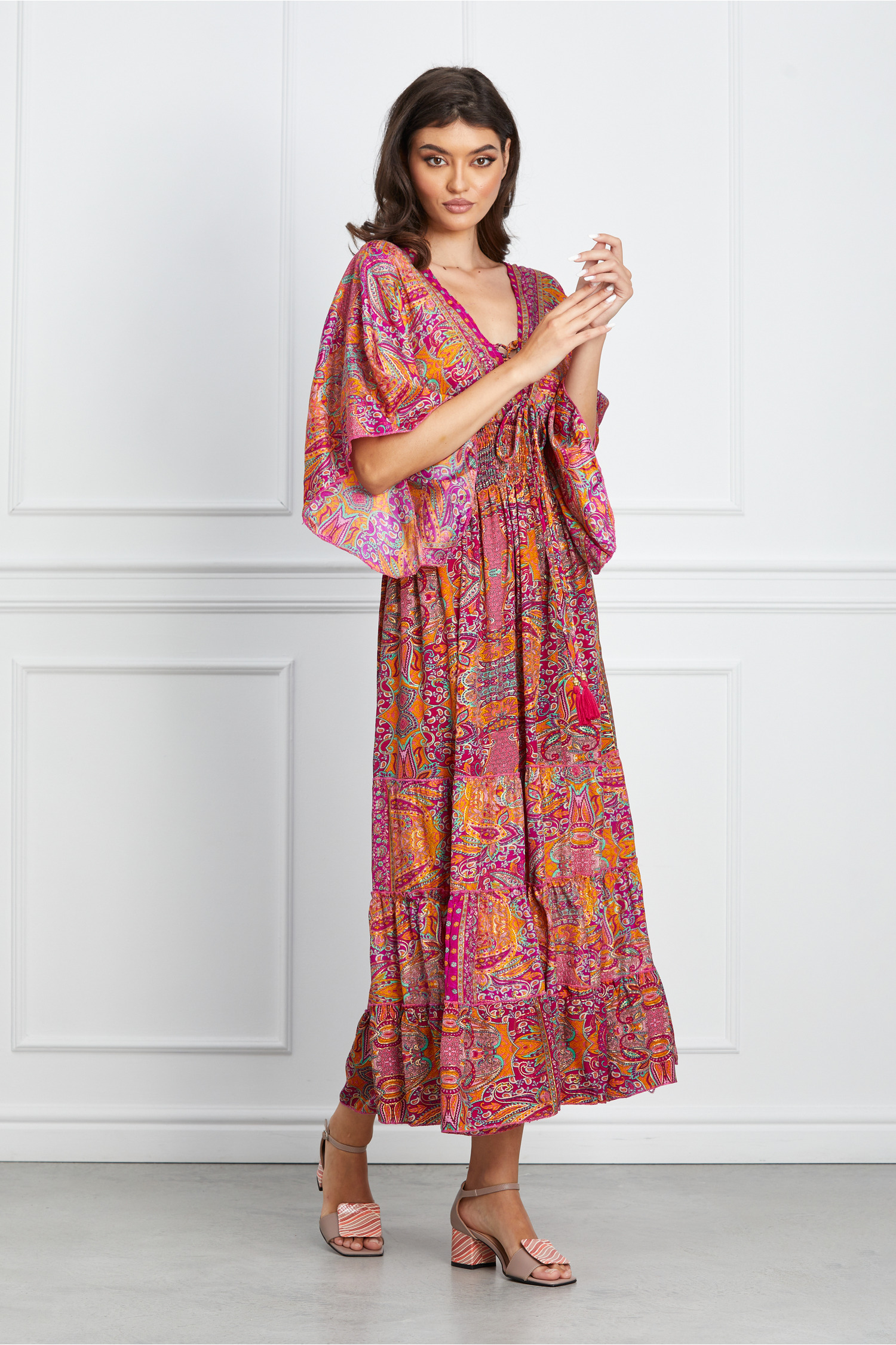 Specification: Rochie Simona fucsia cu imprimeuri aurii si orange