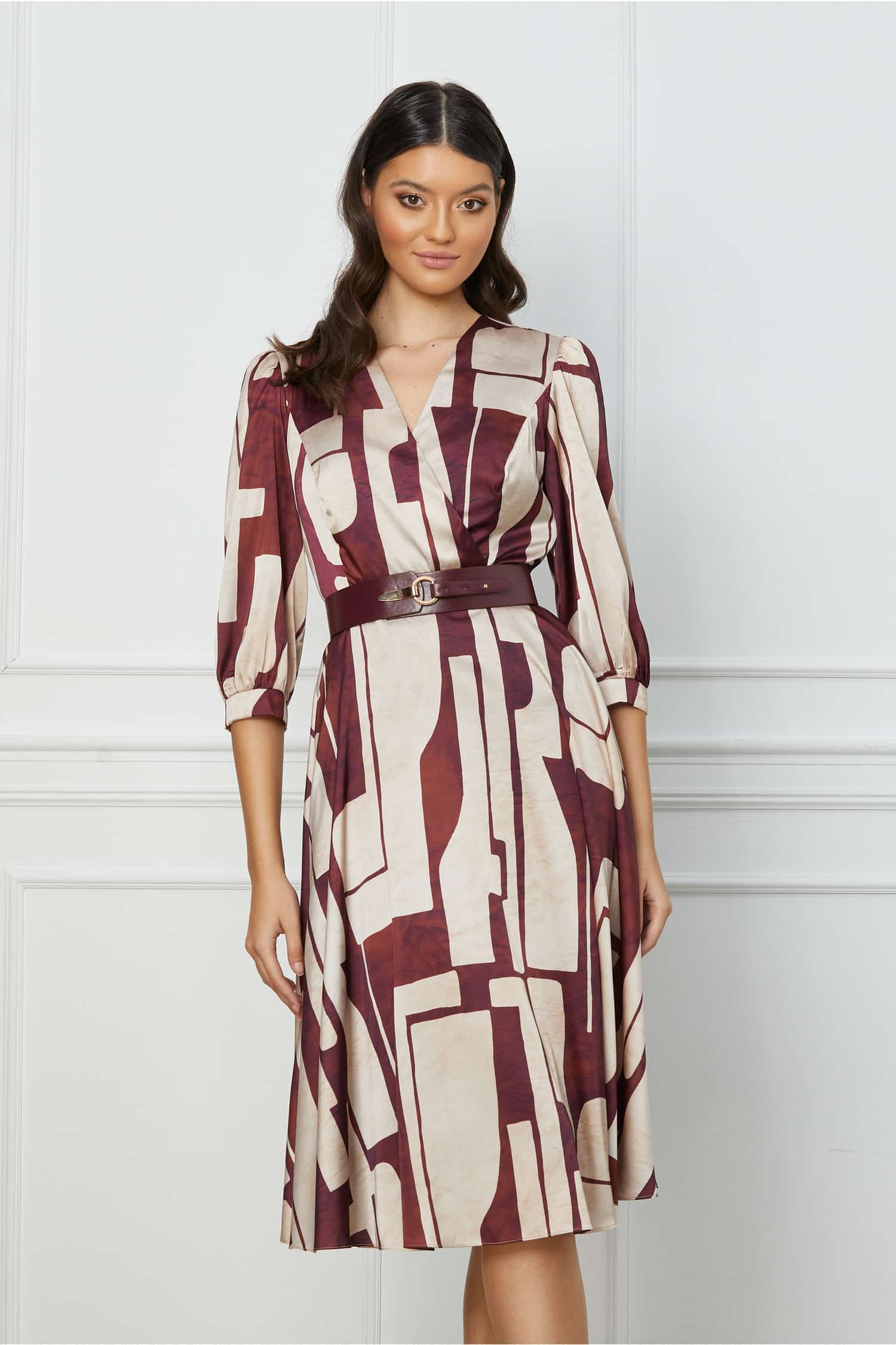 Specification: Rochie Sorina bordo cu imprimeuri bej si curea in talie