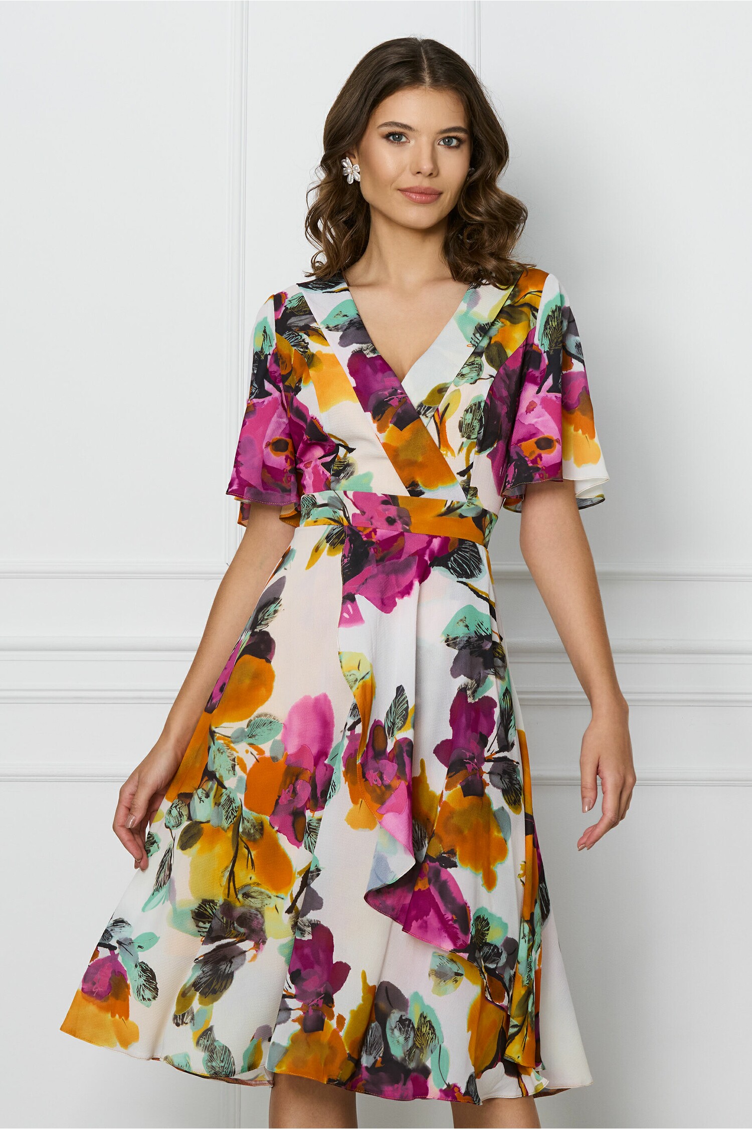 Rochie vaporoasa cu volan pe fusta. Are decolteu in V petrecut, maneci scurte si croi clos.? Rochie vaporoasa Decolteu in V petrecut Maneci scurte Croi clos Captusita pe interior Inchidere cu fermoar la spate Material: Voal Compozitie: 55% Viscoza, 45% Poliester *Va rugam verificati eticheta produsului inainte de curatare! *Pozitia tiparului imprimeului poate fi diferita datorita taierii. *Va rugam sa retineti ca o usoara discrepanta de culoare ar trebui sa fie acceptabila datorita luminii si luminozitatii ecranului. ? *Va rugam verificati ghidul de marimi, in cm, pentru a alege corect marimea. ?