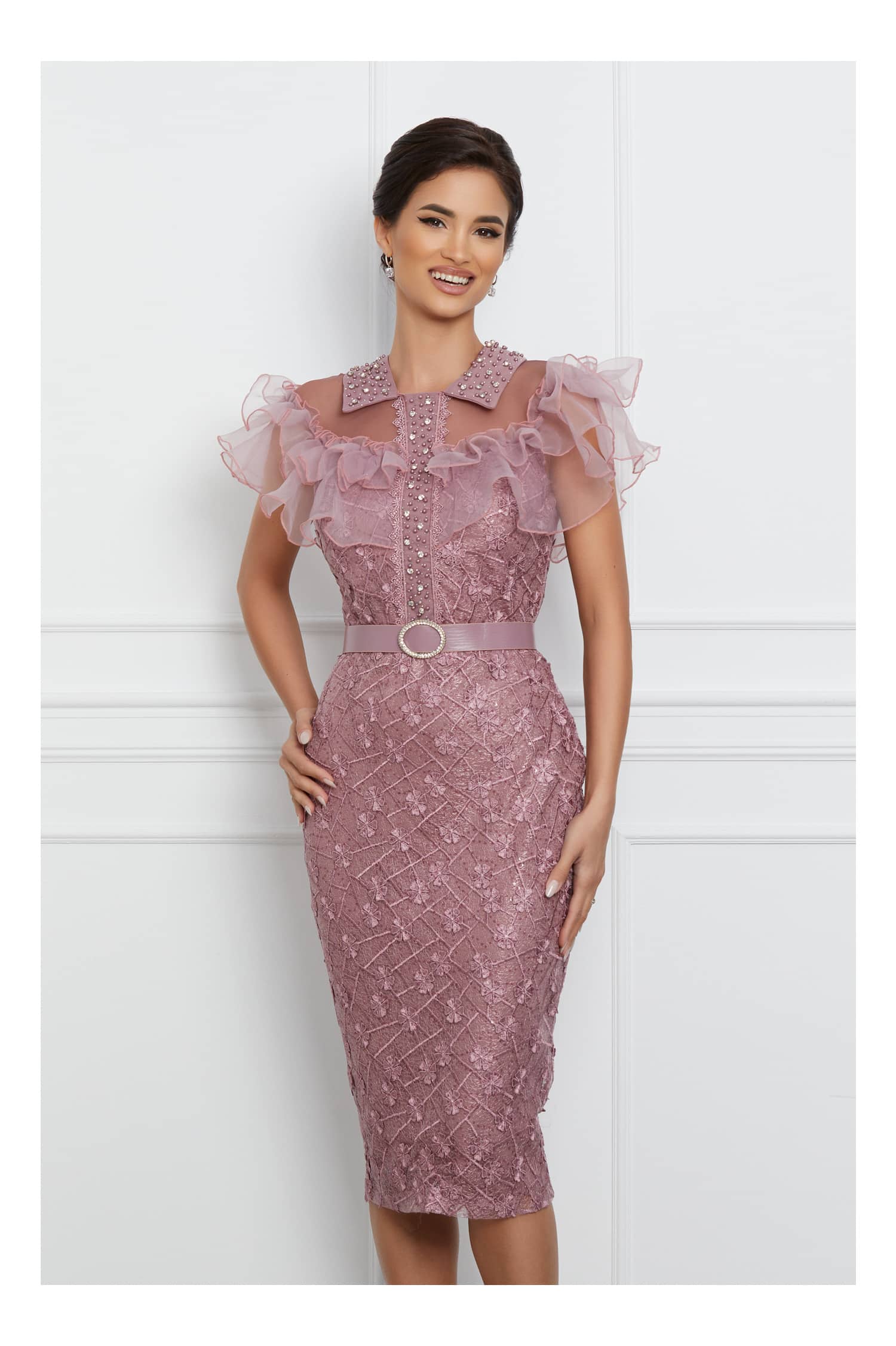 Rochie neagra eleganta cu volane in zona bustului si curea detasabila in talie. Are guler ascutit accesorizat cu strasuri si perlute. Croiul este conic si se inchide cu fermoar la spate. Rochie eleganta Guler ascutit Maneci scurte tip volan Croi conic Curea detasabila in talie Captusita pe interior Inchidere cu fermoar la spate Material: Dantela Compozitie: 95% Poliester, 5% Elastan Instructiuni de intretinere:     *Va rugam verificati eticheta produsului inainte de curatare! *Modelul are inaltimea de 174 cm. *Va rugam sa retineti ca o usoara discrepanta de culoare ar trebui sa fie acceptabila datorita luminii si luminozitatii ecranului.  *Va rugam verificati ghidul de marimi, in cm, pentru a alege corect marimea.