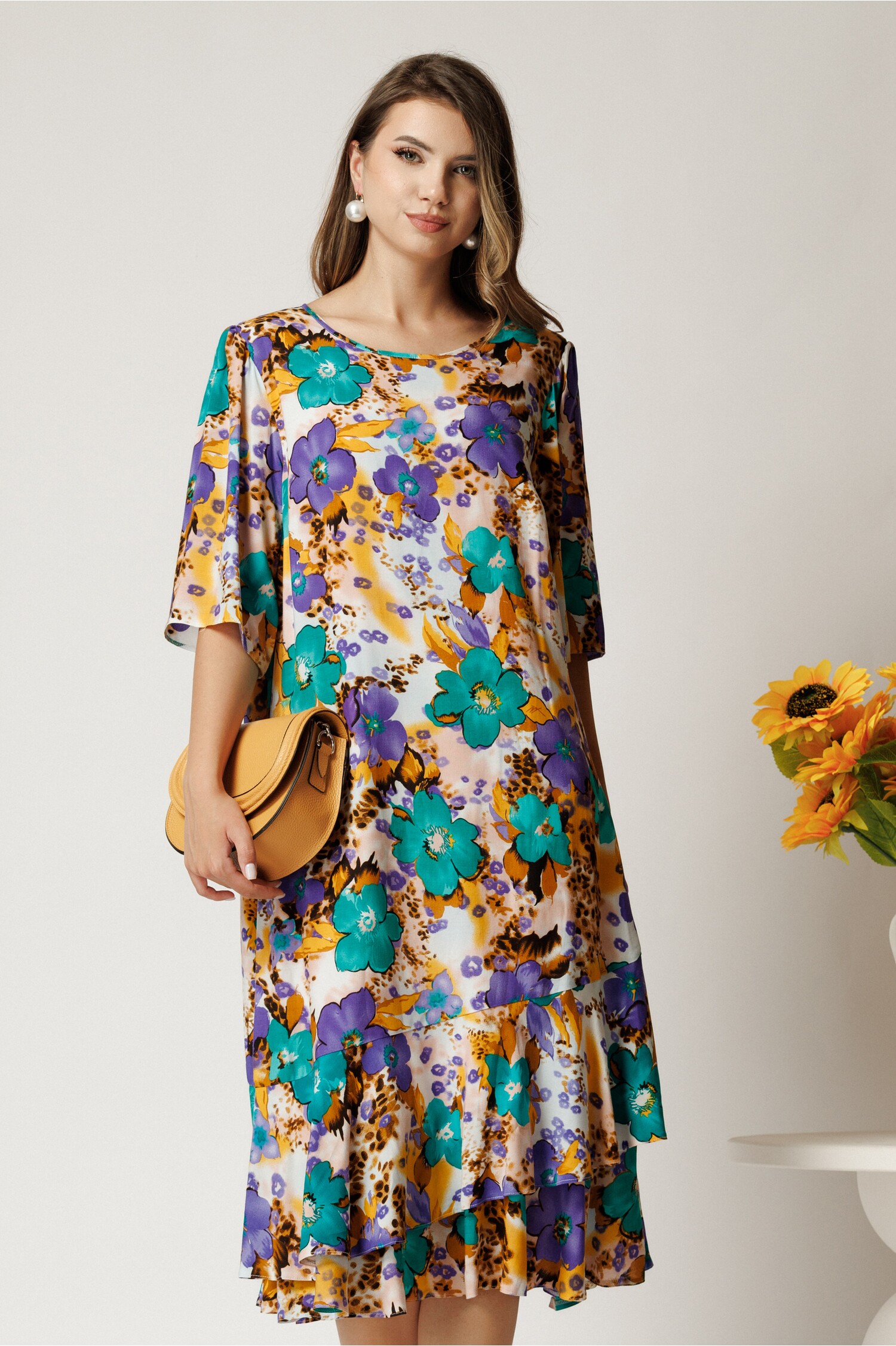 Specification: Rochie vaporoasa cu flori turcoaz si mov din viscoza cu croi drep