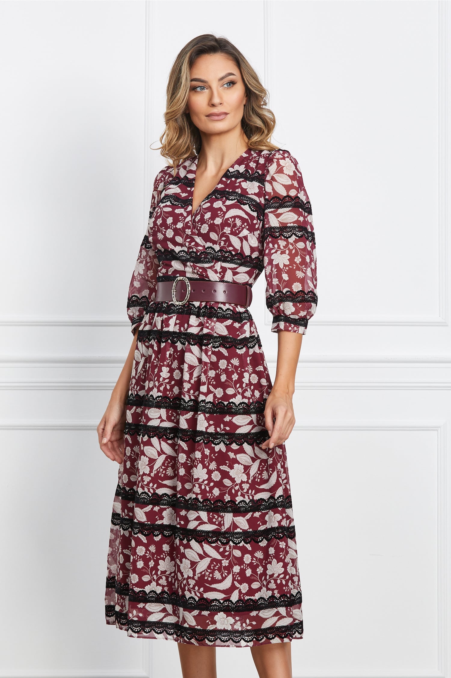 Specification: Rochie Vera bordo cu imprimeuri bej si curea in talie