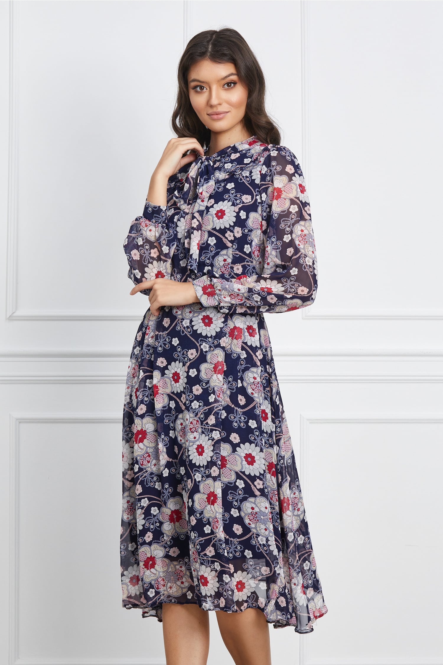 Specification: Rochie Veronica bleumarin cu flroi bordo si guler tip esarfa