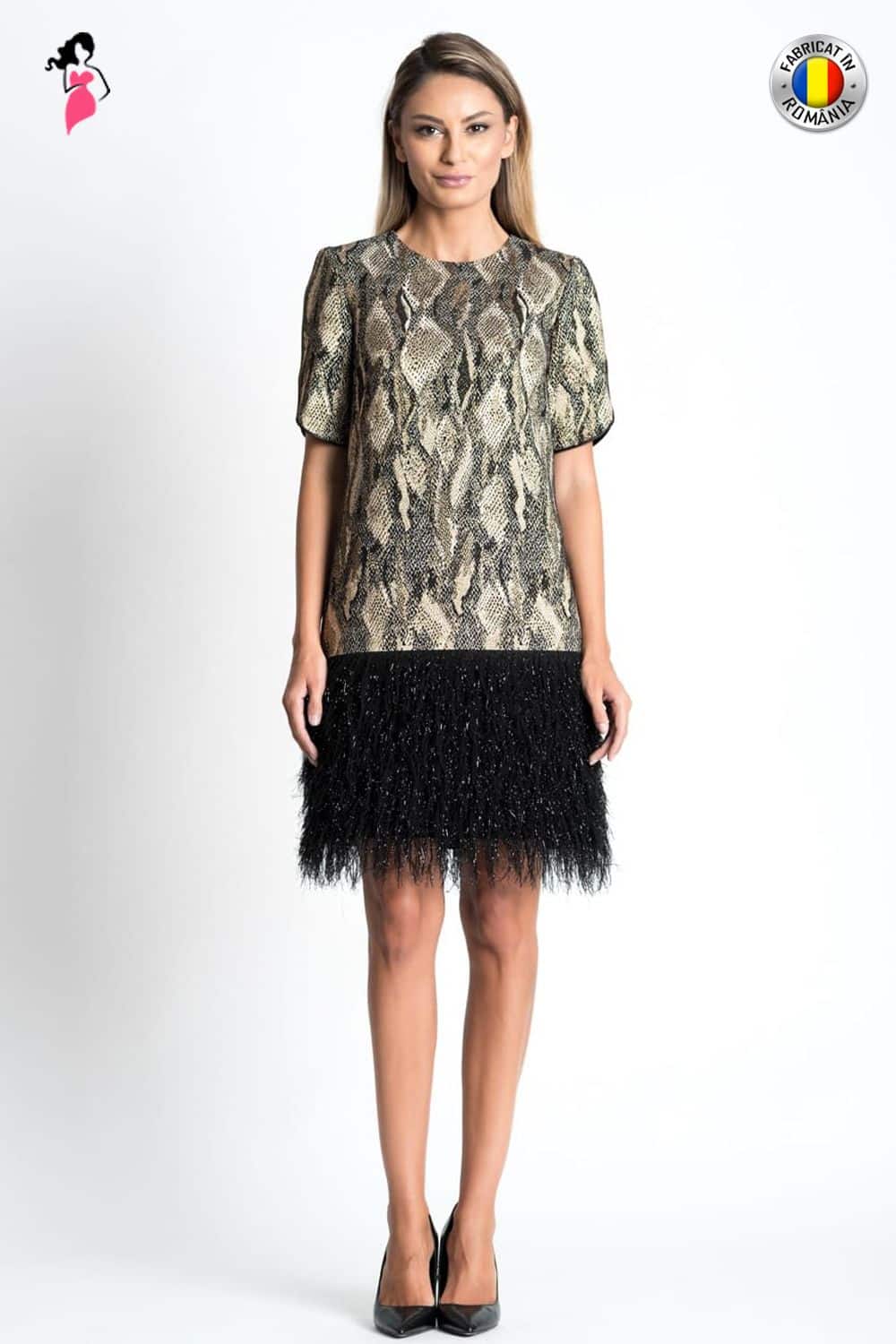 Rochie Xara eleganta din material print sarpe in cele mai actuale tendinte linie lejera usor in A maneci scurte conturate cu vipusca neagra un extratouch de design. Cu aceasta rochie chic cu elemente decorative evidente nu poti trece neobservata la o petrecere insa in acelasi timp vei ramane o aparitie eleganta rafinata.Caracteristici:fermoar ascunsbordura neagra decorativamaneci conturate cu vipuscadecolteu la baza gatuluicompozitie:vascoza fir metalic elastan. poliesterIntretinere:Respectati instructiunile de curatare de pe eticheta produsului.Produs romanesc.Info model:inaltime 170 cm poarta marimea S