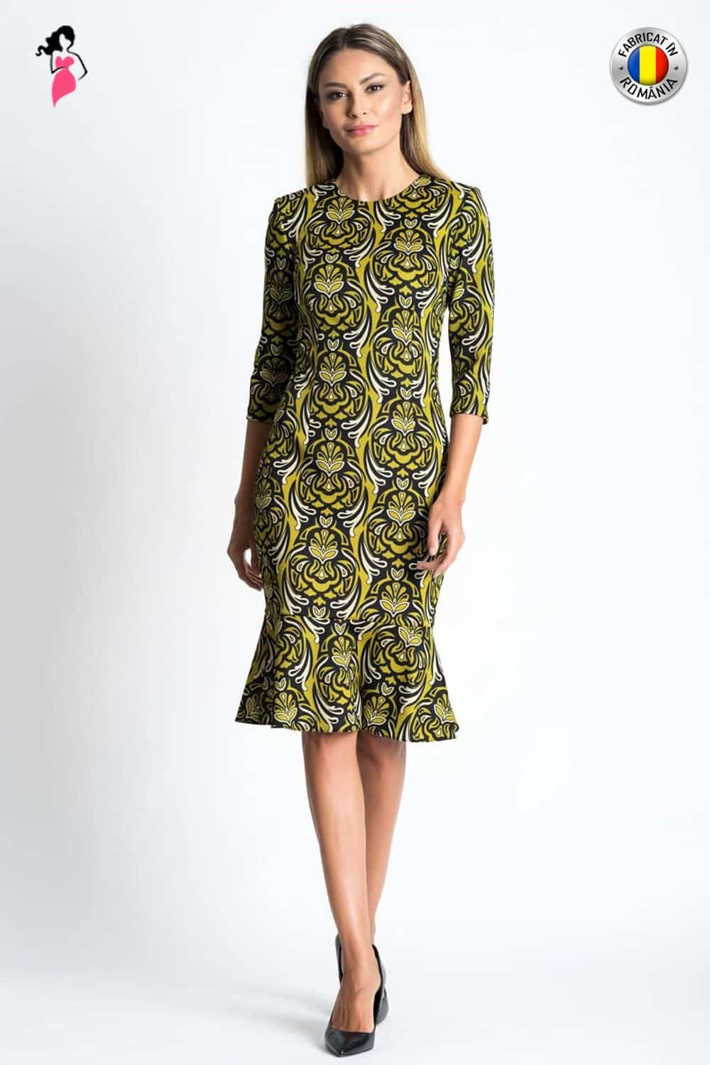 Specification: Rochie Xara eleganta conica cu imprimeu baroc si volan la baza
