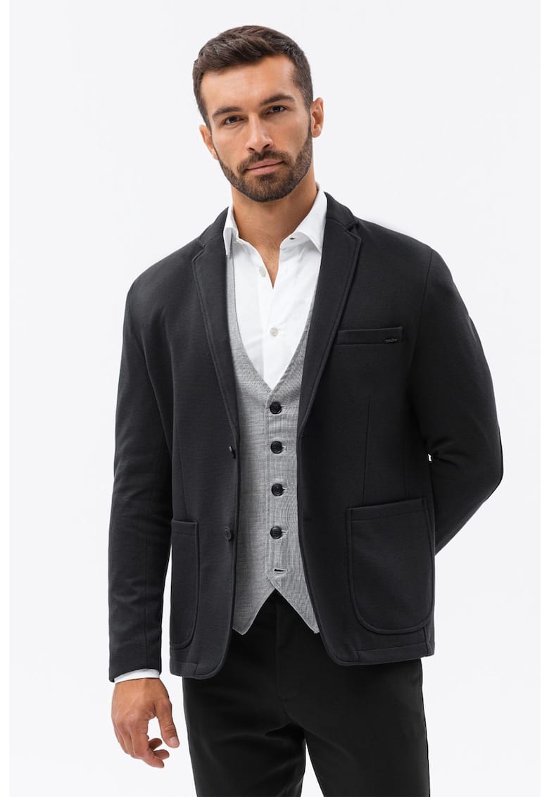 Caracteristici Culoare: negru Imprimeu: uni Material: poliester – bumbac Stil: casual Croiala: regular fit Guler: cu revere decupate Lungime maneca: maneca lunga Buzunare: 2 aplicate – pe partea din fata – unul pe piept Detalii: slit in partea din spate – la terminatie Sistem inchidere: nasturi Compozitie Exterior: 65% poliester – 35% bumbac