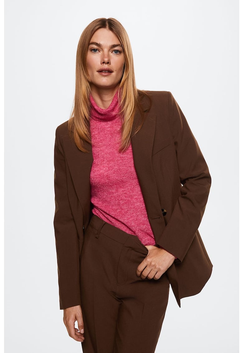 Caracteristici Culoare: maro Stil: casual Croiala: regular fit Material: poliester – sustenabil Imprimeu: uni Guler: cu revere decupate Lungime maneca: maneca lunga Buzunare: 2 Sistem inchidere: nasturi Compozitie Exterior: 76% poliester – 18% viscoza – 6% elastan