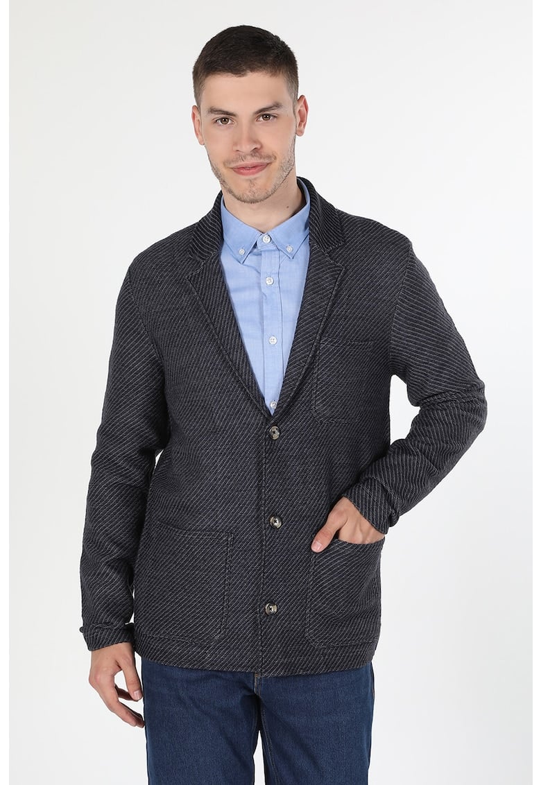 Caracteristici Culoare: albastru marin Imprimeu: dungi Material: lana – acril Stil: casual Croiala: regular fit Guler: cu revere Lungime maneca: maneca lunga Buzunare: aplicatie frontala Sistem inchidere: nasturi Compozitie Exterior: 84% acrilic – 16% lana