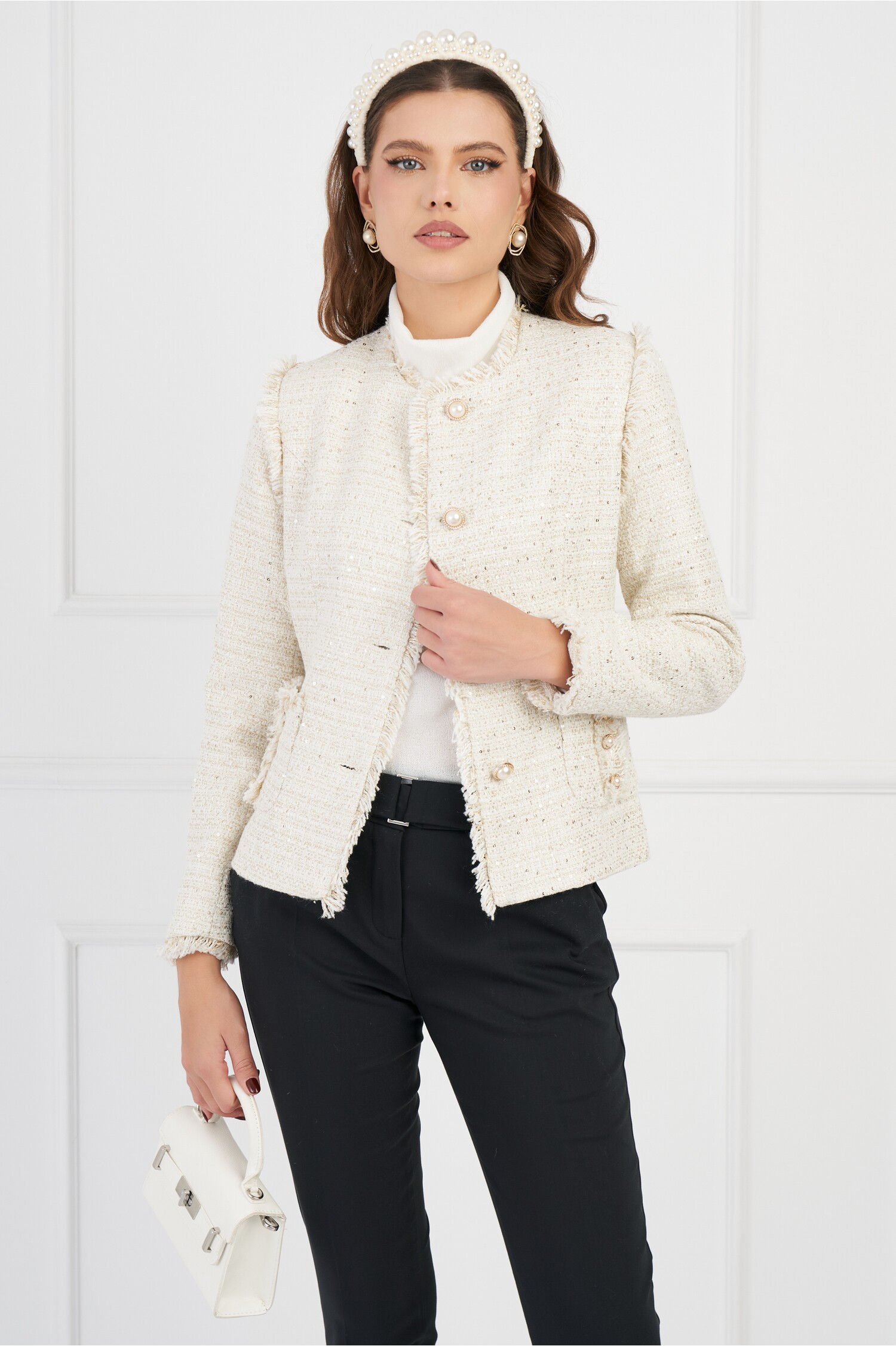 Sacou LaDonna ivory din tweed cu fir lurex si paiete
