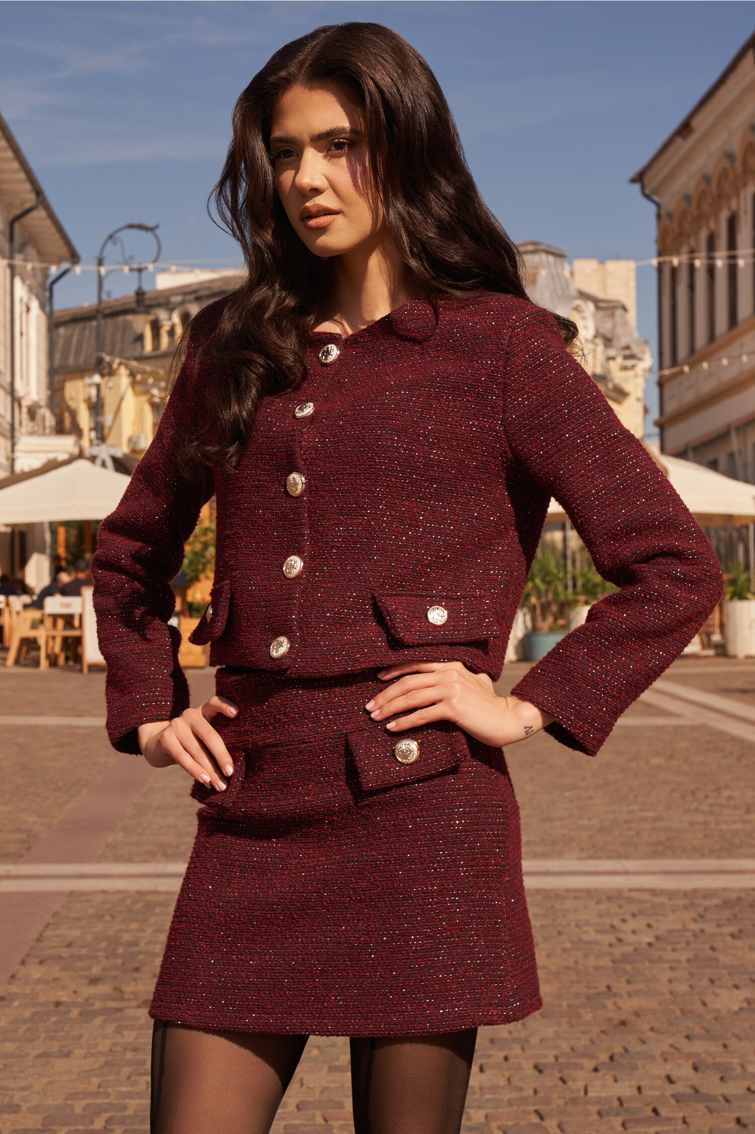 Specification: Sacou Mara bordo scurt din tweed cu insertii din fir lurex