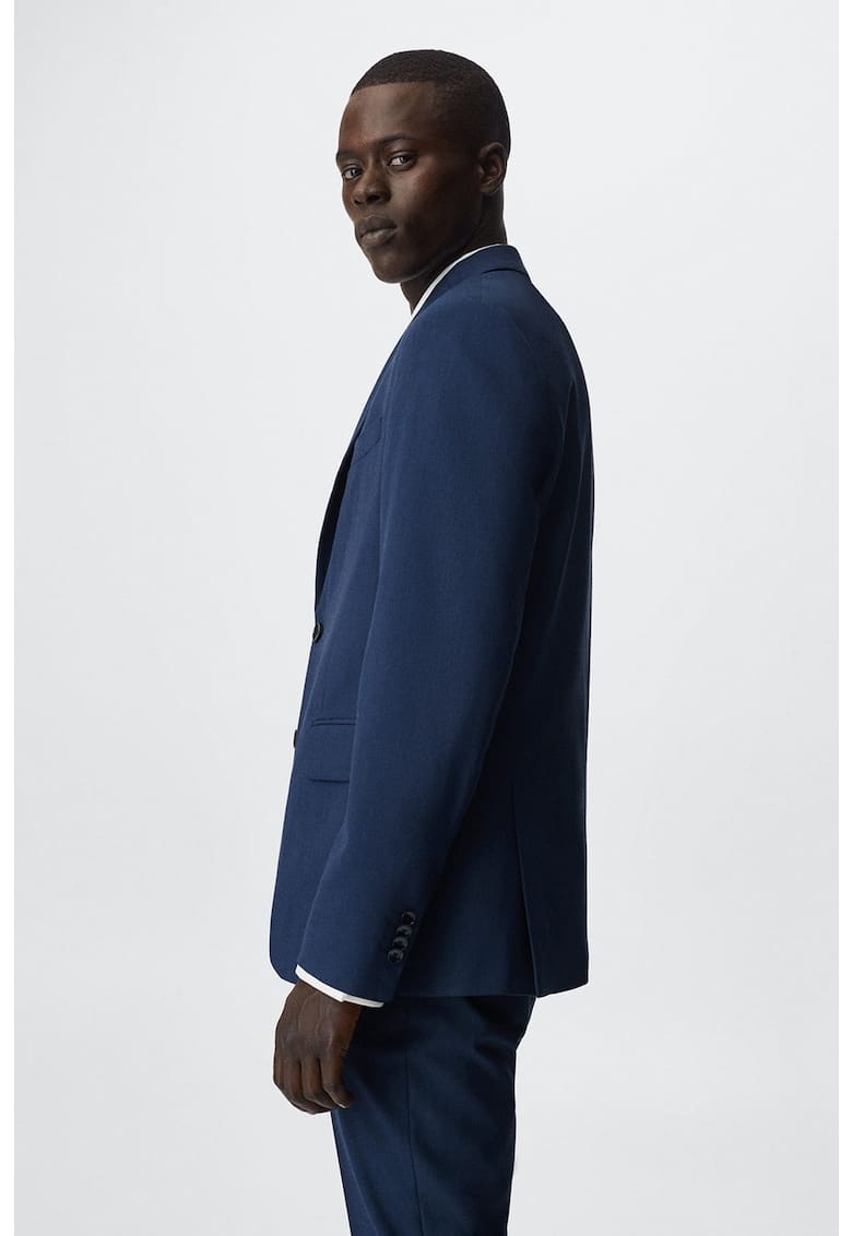 Caracteristici Culoare: bleumarin Imprimeu: uni Material: poliester – viscoza Stil: elegant Croiala: slim fit Guler: cu revere Lungime maneca: maneca lunga Buzunare: 2 cu clapa Sistem inchidere: nasturi Compozitie Exterior: 67% poliester – 32% viscoza – 1% elastan Captuseala: 53% poliester – 47% viscoza
