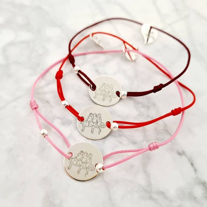 Specification: Set 3 bratari personalizate – Inima Soul Sisters – Banut 15 mm cu 3 siluete cu rochite Surori/Prietene – Bilute 4 mm – Argint 925 – Snur reglabil