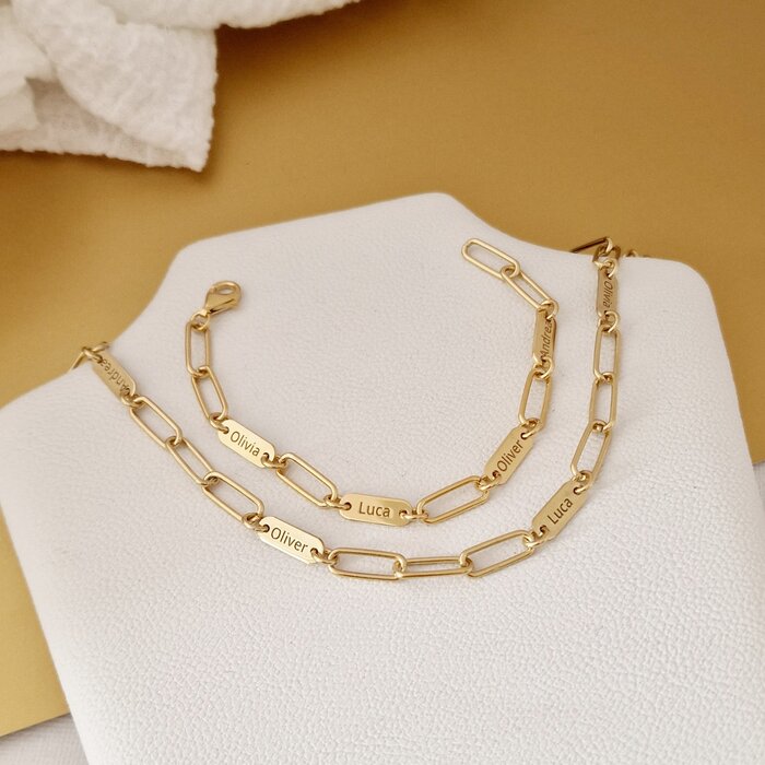 Specification: Set lantisor si bratara TOTUL MEU – 4 placute personalizate si lant din zale mari – Argint 925 placat cu Aur Galben 18K