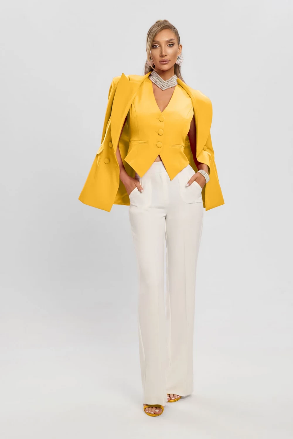 Acest SET format din SACOU si VESTA este o combinatie sofisticata si eleganta perfecta pentru tinutele business sau evenimente speciale. Sacoul oversize are un croi structurat cu umeri accentuati si o purtare lejera pe umeri ceea ce ii ofera un aer modern si rafinat. Vesta este cambrata cu nasturi ton pe ton si o croiala asimetrica in partea de jos evidentiind silueta feminina. Culoarea galben aprins adauga o nota de indrazneala si eleganta iar detaliul floral de la gat confera un plus de stil si originalitate. Acest set este ideal pentru femeile care doresc sa iasa in evidenta printr-o tinuta impecabila si sofisticata.IntretinereRespectati instructiunile de curatare de pe eticheta produsuluiInfo model: inaltime 175cm poarta marime SProdus romanesc. CAPTUSEALA: 100% Poliester EXTERIOR: 88% Poliester 12% Elastan