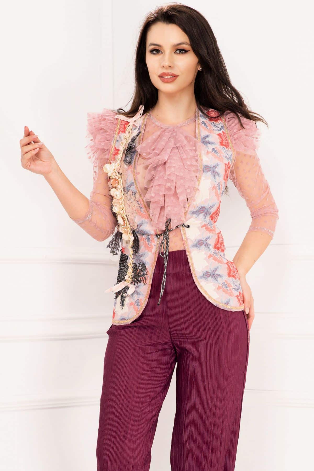 Specification: Vesta romantic vintage Venezia roz cu aplicatii pretioase si volanase din tulle
